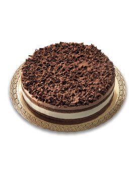 Chokoladelagkagebund med chokoladecreme og kirsebærcreme med kirsebær, dekoreret med mørke chokoladekrøller og kakao.