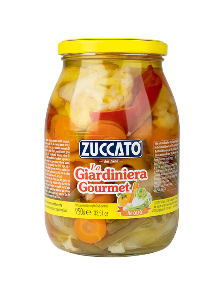Ingredienser: Blandende grøntsager i varierende mængde (peberfrugt, fennikel, gulerødder, bønner, blomkål, løg) 65%, solsikkeolie, vineddike, ekstra jomfru olivenolie 4%, sukker, salt.