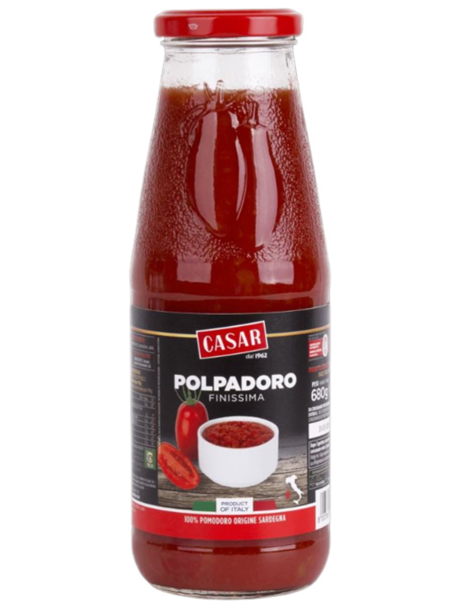 Fint hakkede tomater Polpadadoro CASAR 720ml i glas flaske.